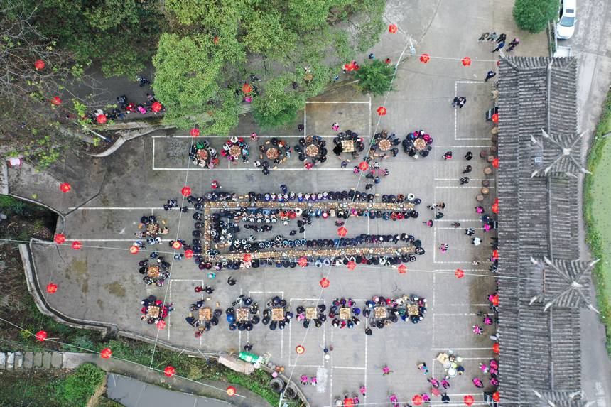 11月24日,在贵州省剑河县磻溪镇化敖村,侗族群众欢聚一堂吃团圆饭。(图片来源:人民网)
