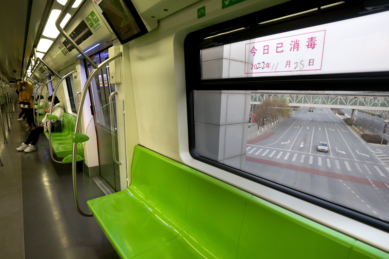 11月28日,早高峰时段,北京地铁十四号线经过园博园站,车厢内乘客稀少。
