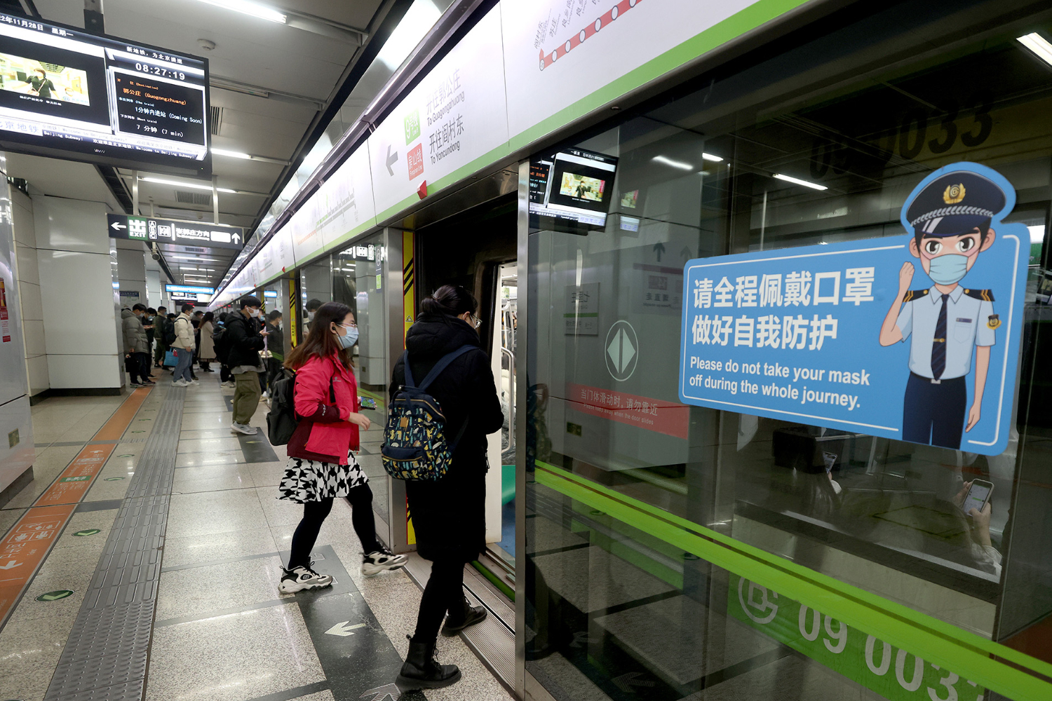 11月28日早高峰时段,市民乘坐北京地铁九号线出行。
