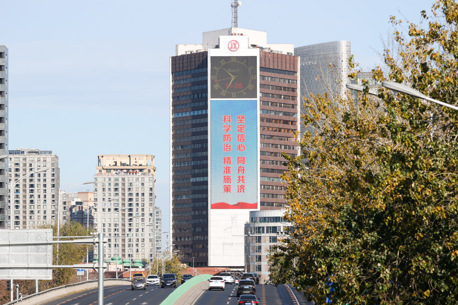 北京一栋楼宇的大屏幕上播放抗击疫情的公益广告。