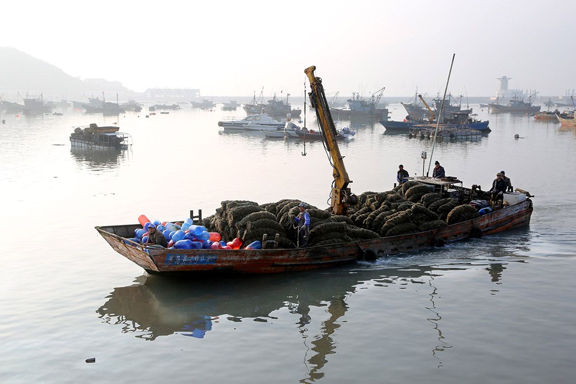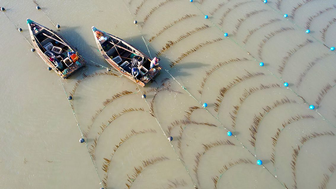 11月23日,在山东省荣成市成山镇鑫城山海上育苗区,养殖工人正在采收海带苗。(图片来源:本文图片除标注外均自中新社)