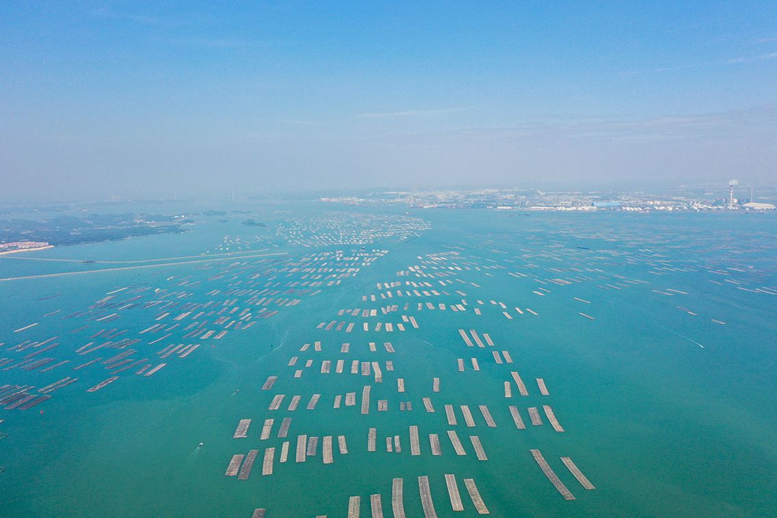 11月3日,广西钦州龙门港外海,航拍蚝排整齐排列在海面上。正值生蚝肥美季节,钦州大蚝在市场上供不应求。目前,钦州已形成了养殖面积超15万亩、产值超30亿元人民币的大蚝养殖产业。