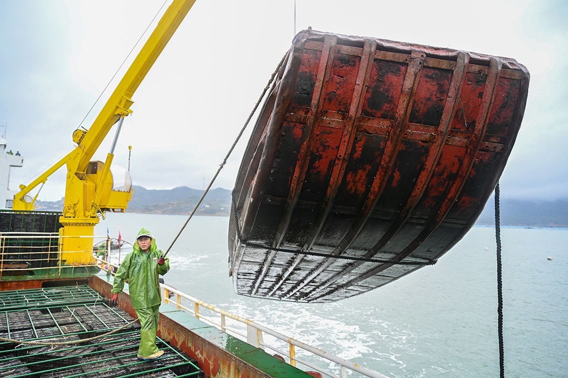 11月25日,在福州连江县苔菉镇后湾海域,渔民把从运输船上卸下的鲍鱼养殖箱运到渔排上进行挂笼立体放养(无人机照片)。当日,福建福州连江县苔菉镇后湾海域热闹非凡,5万多笼鲍鱼从山东荣成乘船归来,返回家乡过冬。(图片来源:新华社)