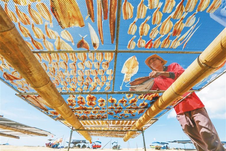 11月26日,在三亚市崖州区梅联社区,渔民晾晒渔获。(图片来源:《辽宁日报》)
