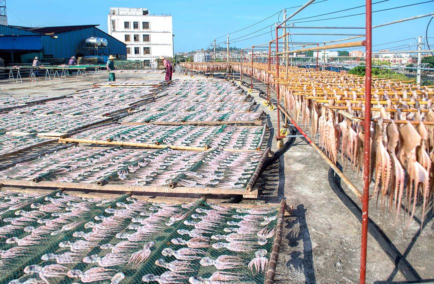 11月21日,在广西北海海城区地角,渔民每天忙着给海味清洗、浸泡、晾晒等,晾晒的海味以章鱼、墨鱼居多。这些海味经过分拣装箱,一车车的发往全国各地,进入千家万户的餐桌。(图片来源:人民网)