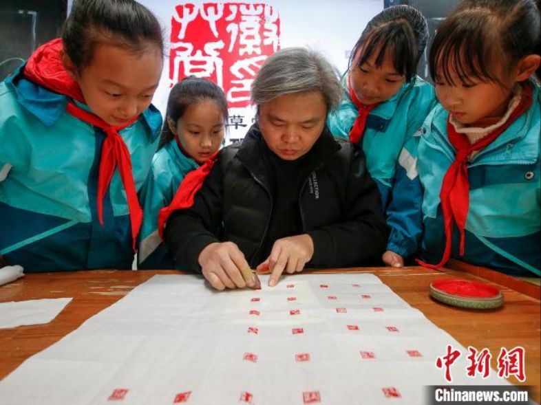 12月8日,老师教学生制作徽州纂刻印章。(图片来源:中新网)