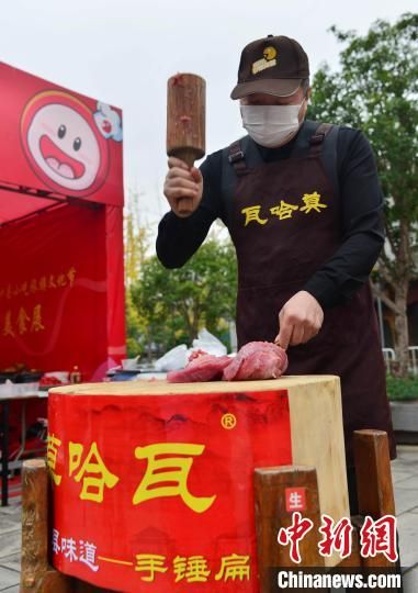 沙县小吃业主在活动上展示手锤扁内制作技艺。(图片来源:中新网)