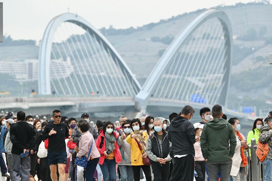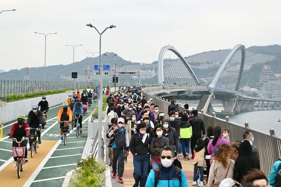 市民于将军澳跨湾连接路上消遣。(图片来源:中新社)