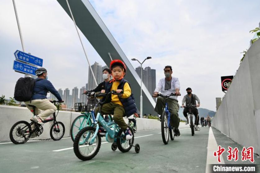 市民于将军澳跨湾连接路骑自行车。(图片来源:中新网)