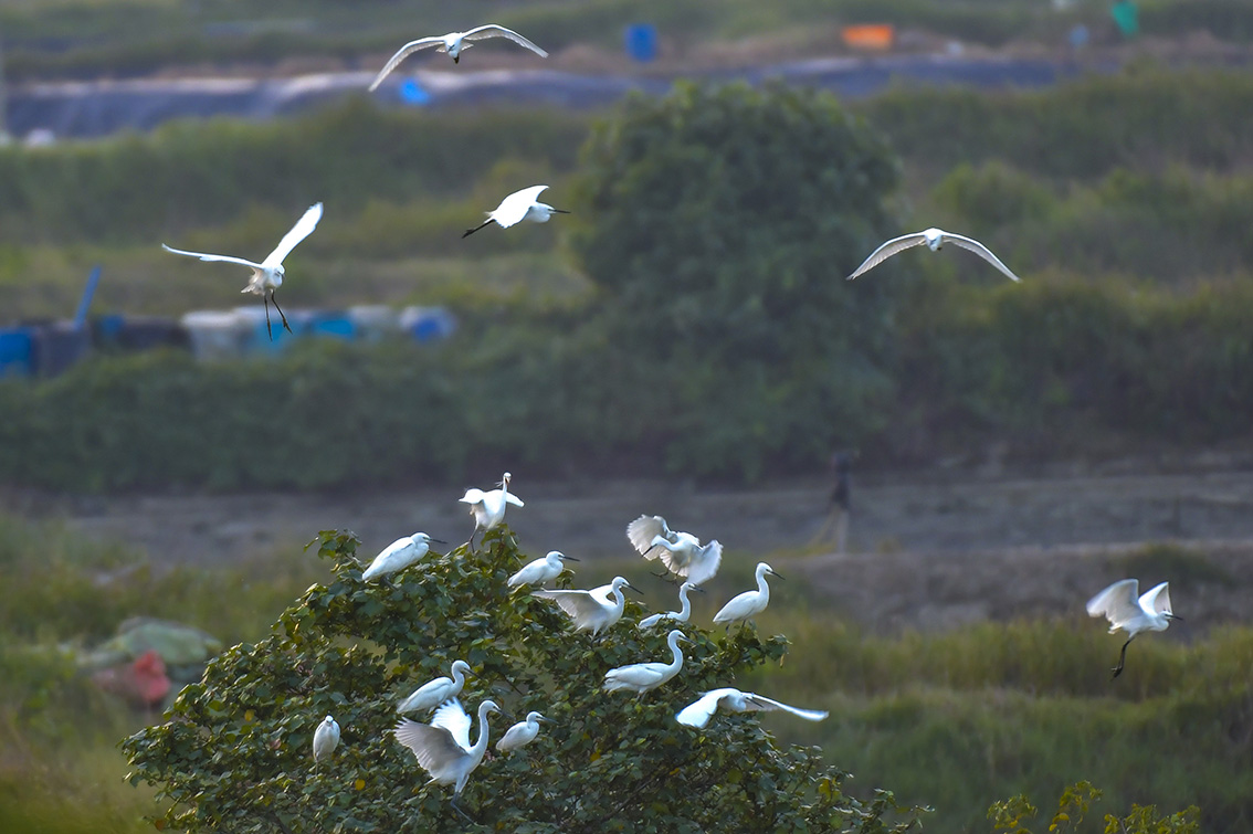 12月13日,位于海南省海口市的东寨港国家级自然保护区,一群白鹭在枝头嬉戏。
