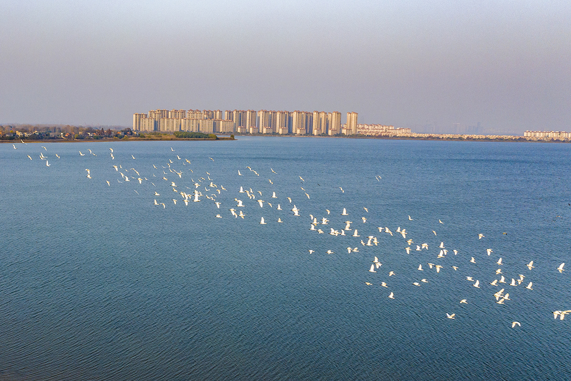 2022年12月12日,长江南岸的安徽省芜湖市三山经济开发区,成群候鸟在龙窝湖湿地水域栖息、飞翔、觅食。