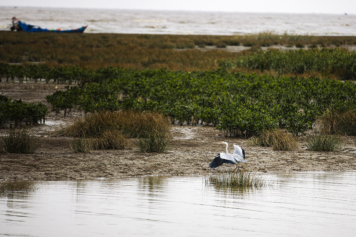 2022年12月12日,位于福建省福州市长乐区的闽江河口湿地,成为大批候鸟觅食、休憩的好场所。图为一只白鹭展开翅膀准备飞翔。