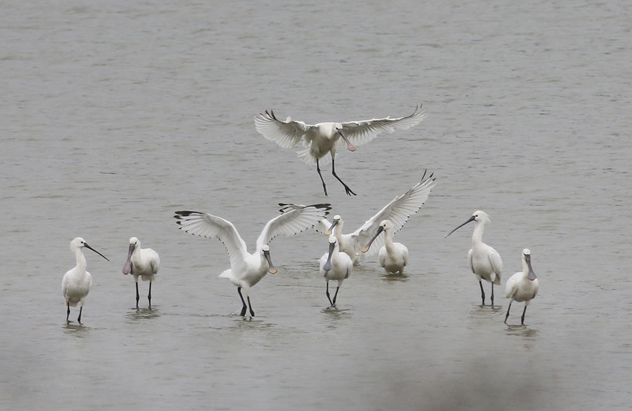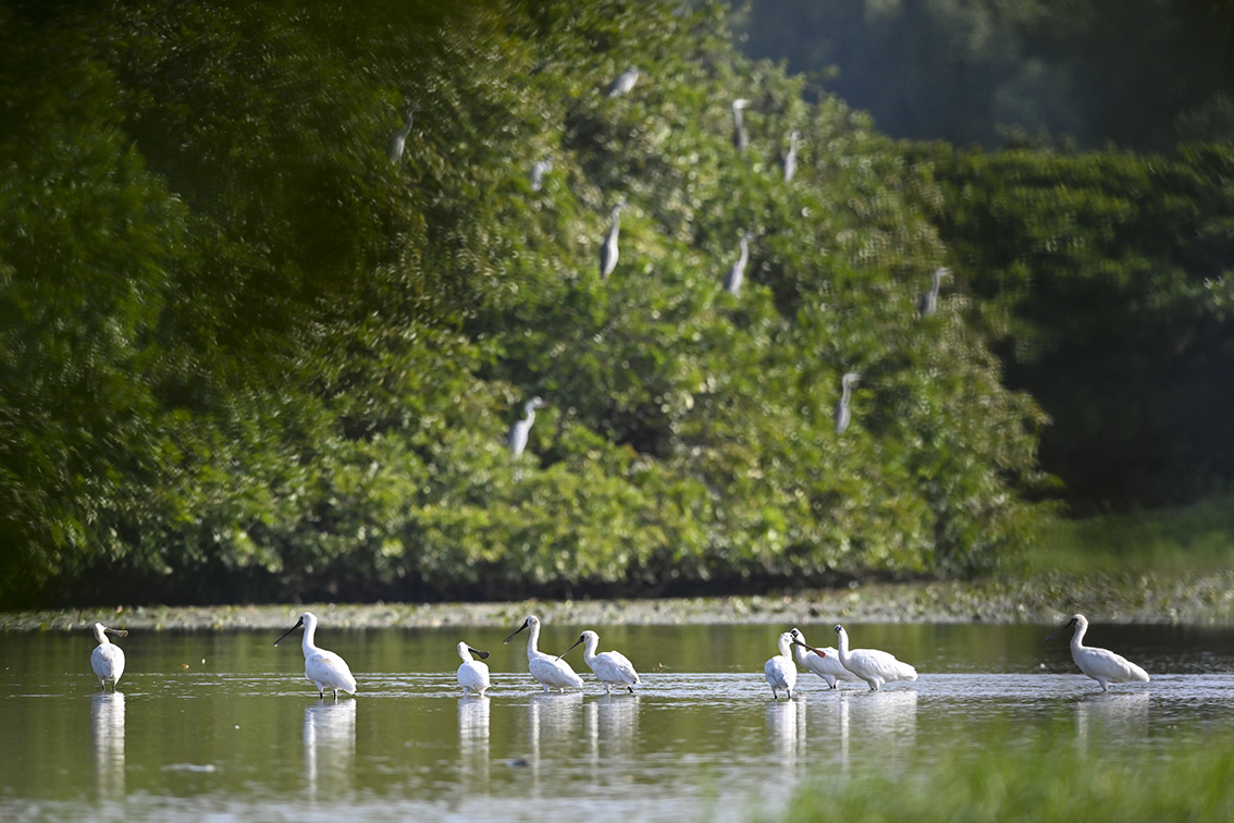 12月9日,广东省广州市,南沙湿地公园内的黑脸琵鹭和白琵鹭。随着冬季到来,大批候鸟飞抵广东湿地,据广东省林业局统计,每年12月至次年1月是候鸟迁徙高峰季,广东省各大湿地公园、滩涂地、海岸线、沿海湿地等迎来了大批候鸟落脚“歇息”,估计将达到30万只以上。