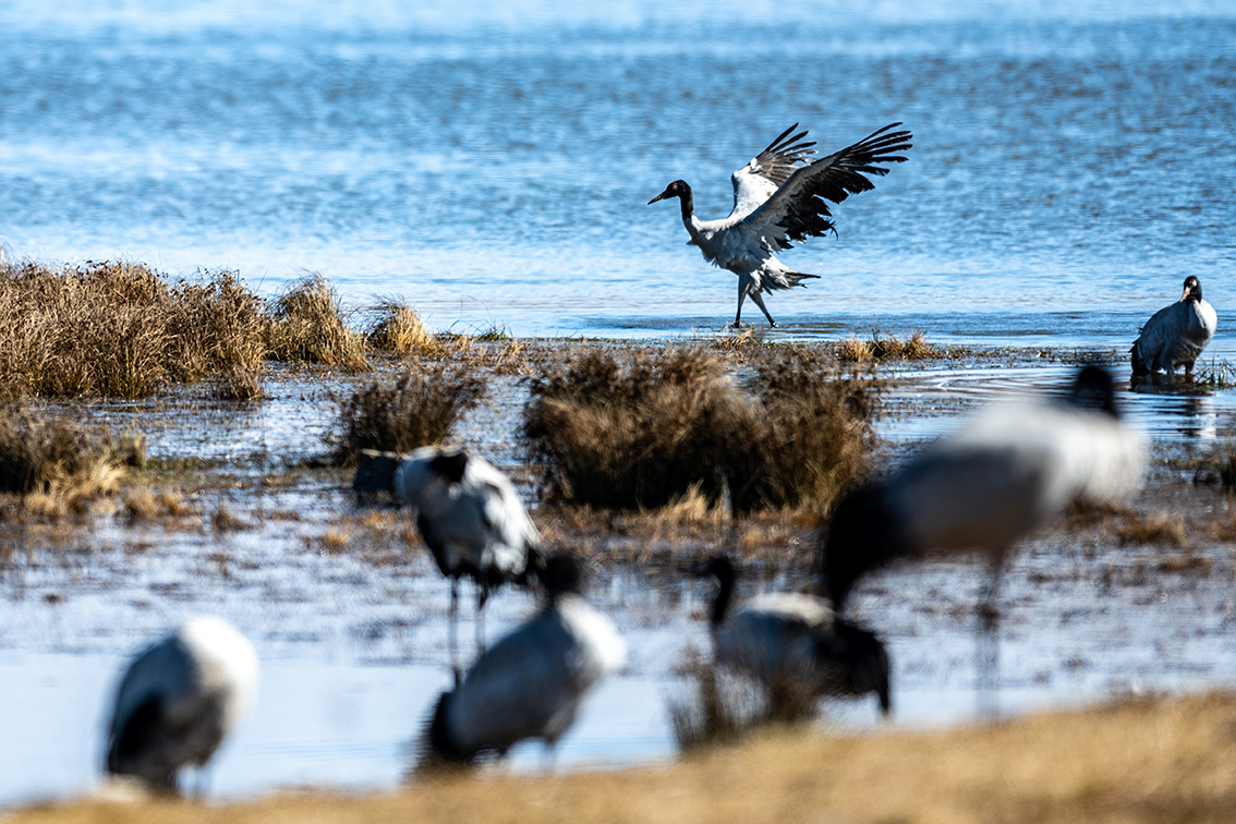 这是12月11日在云南大山包黑颈鹤国家级自然保护区内拍摄的黑颈鹤。(图片来源:新华社)