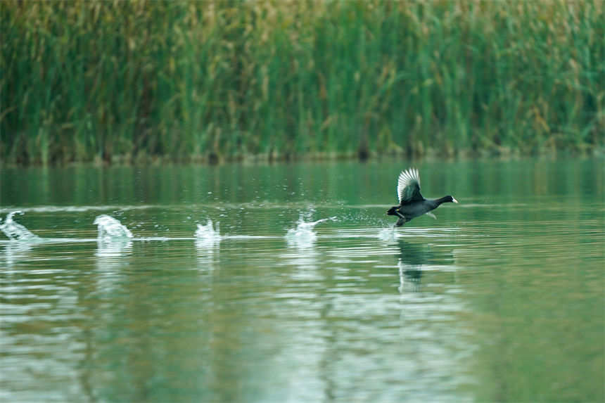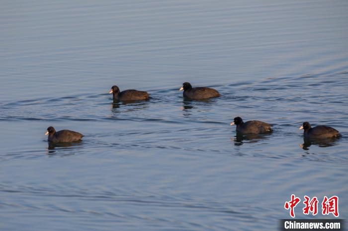 冬日气温渐冷,山西长治上党区陶清河湿地,一群白骨顶鸡在水面游弋。(图片来源:中新网)