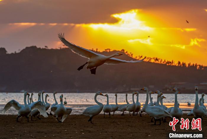 12月11日,在山东省荣成市成山镇天鹅湖湿地,越冬大天鹅伴着彩霞嬉戏、飞舞。(图片来源:中新网)