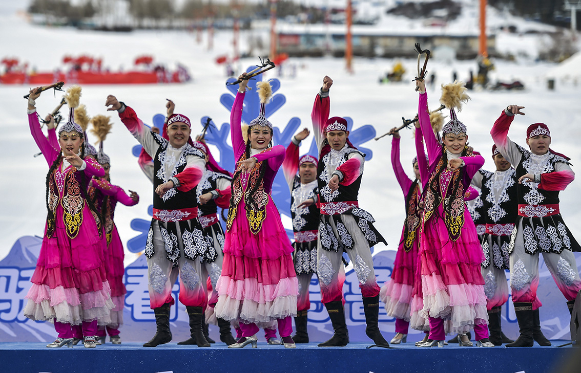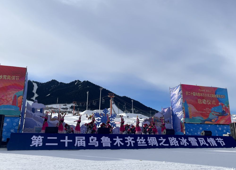 第二十届乌鲁木齐丝绸之路冰雪风情节开幕式现场的歌舞表演。(图片来源:新华社)