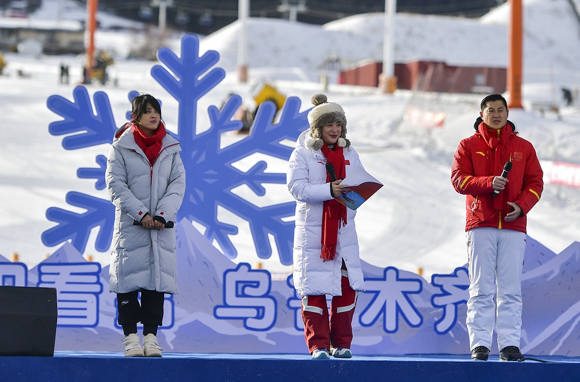 开幕式上,世界冠军郭丹丹(中)、于静(左)、刘忠庆(右)发出“跟着冠军来乌鲁木齐滑雪”倡议。(图片来源:中新社)