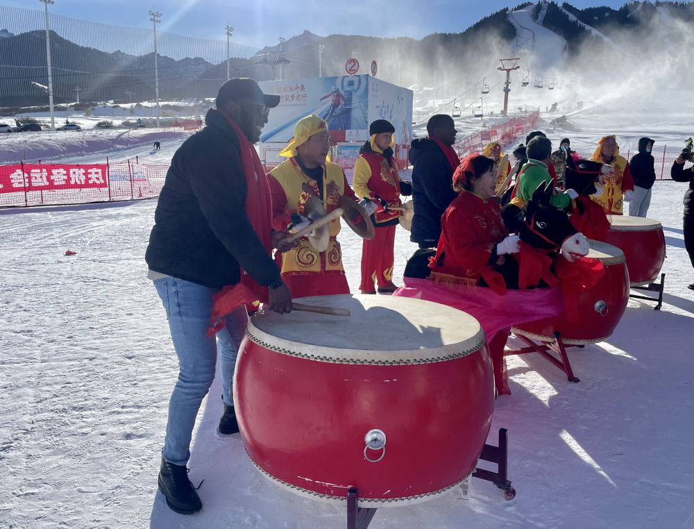 第二十届乌鲁木齐丝绸之路冰雪风情节开幕式现场外国人体验中国锣鼓。(图片来源:新华社)