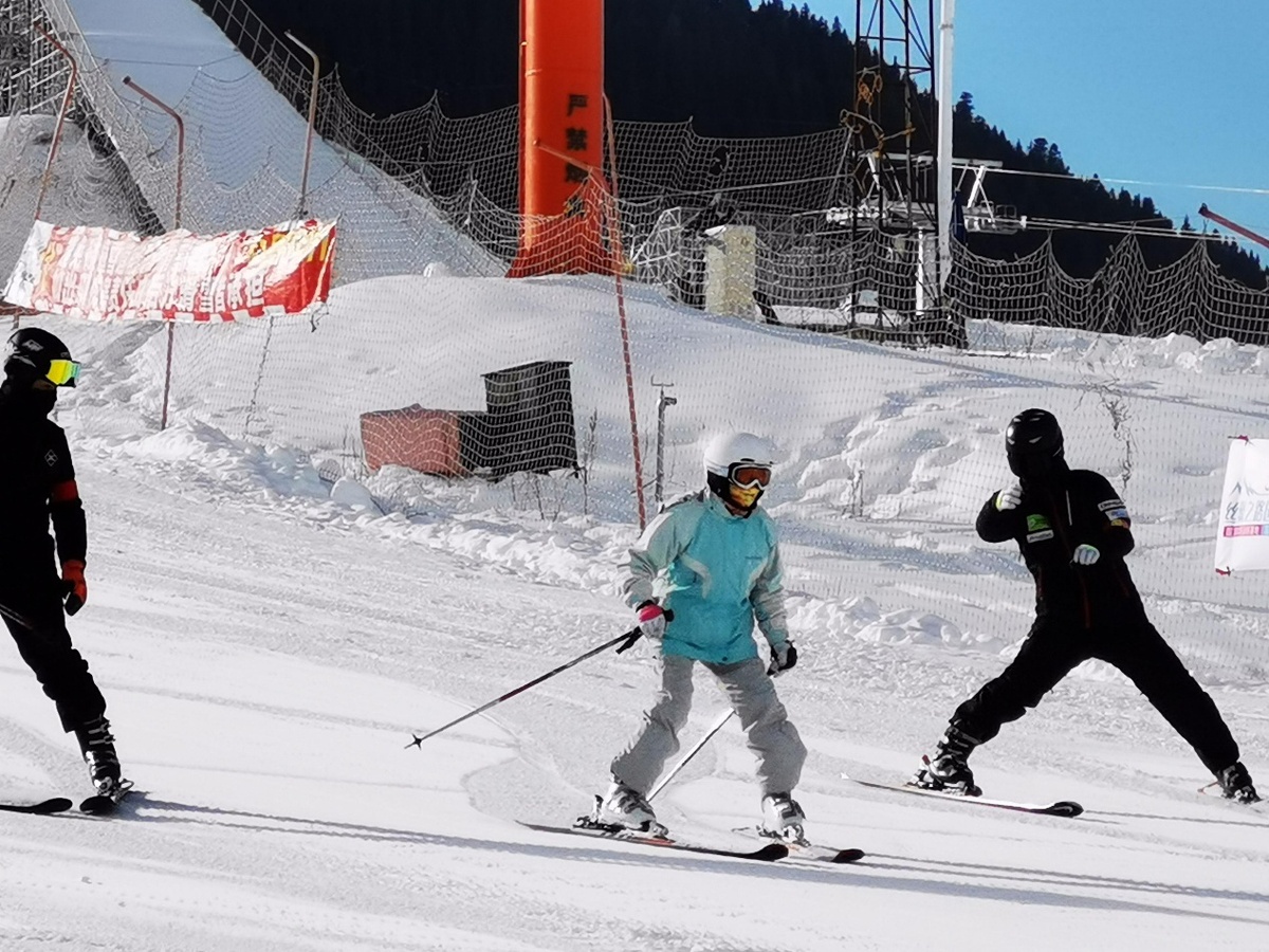 姿态优雅的滑雪爱好者刘志华(中)。(图片来源:中国日报网)