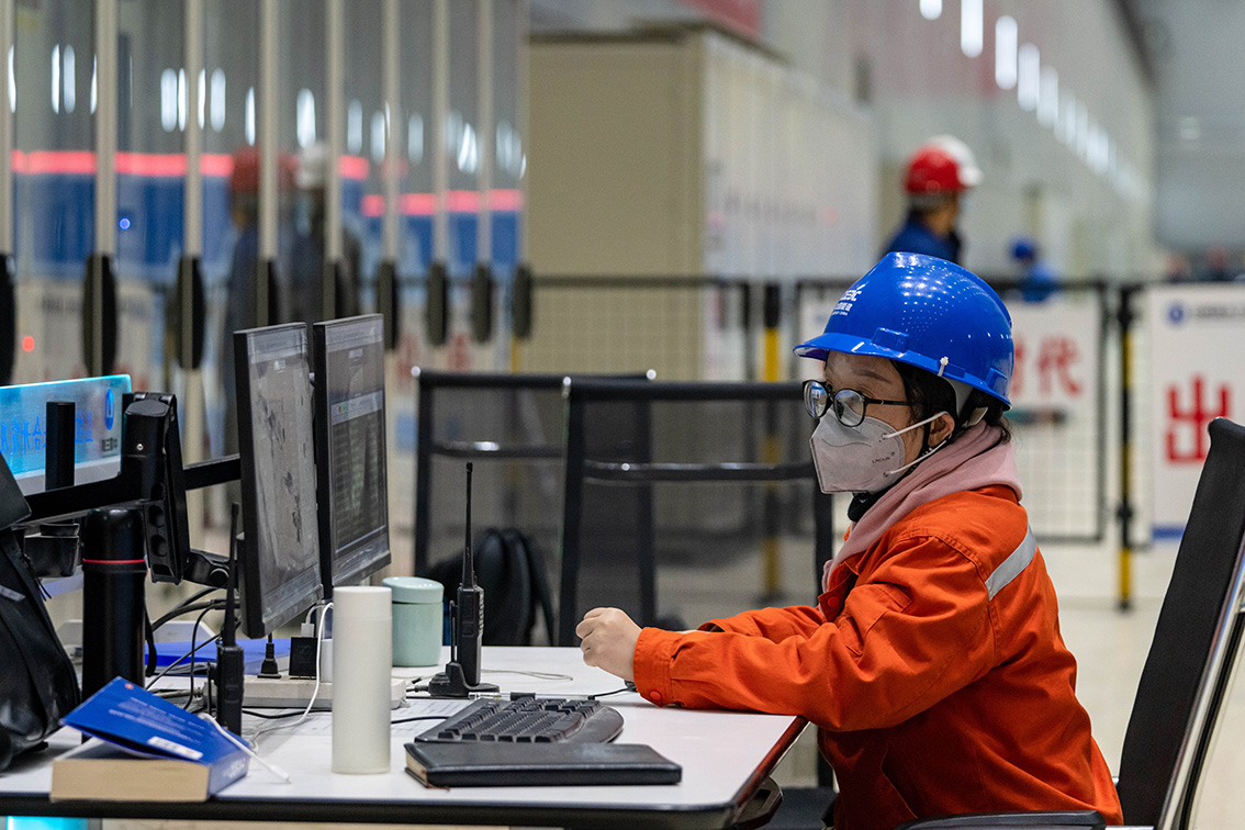 12月19日,在白鹤滩水电站右岸地下厂房,工作人员在监视机组运行状态。