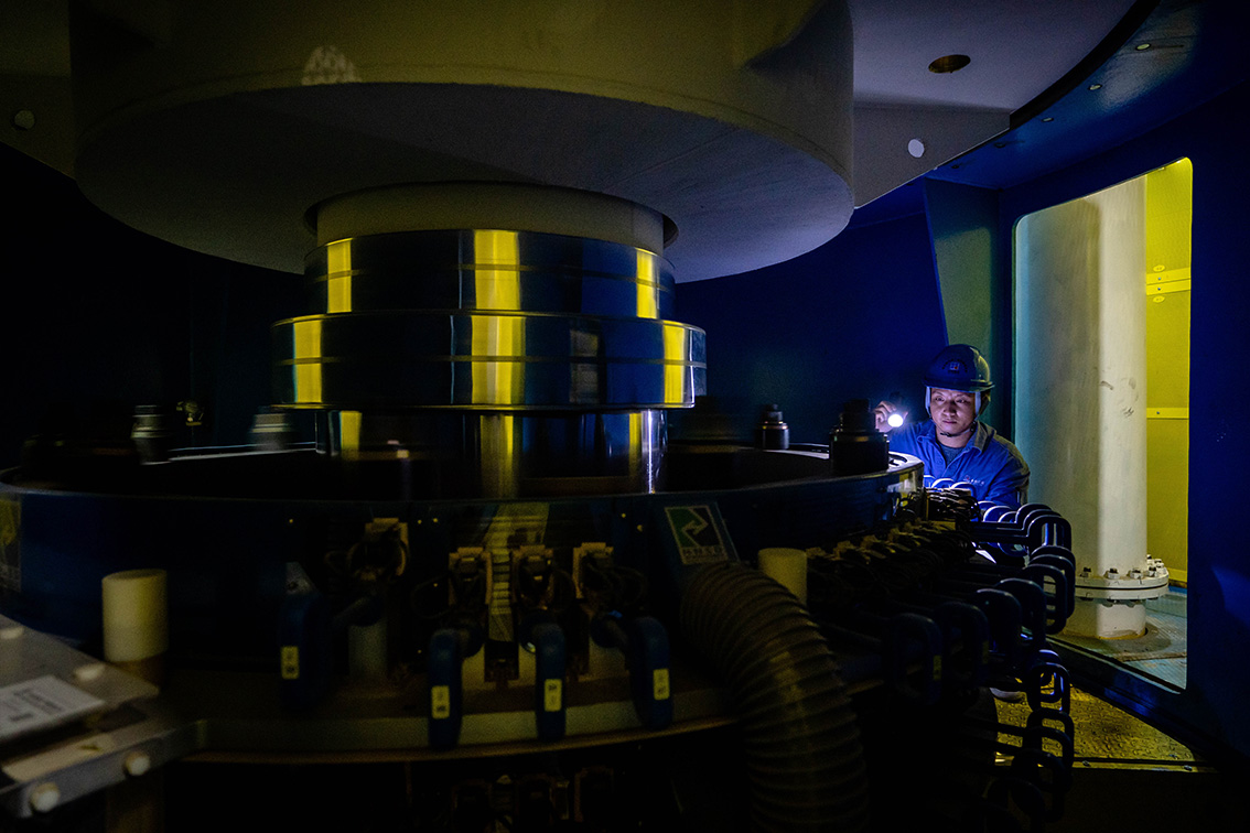 12月19日,在白鹤滩水电站右岸地下厂房,工作人员在水车室巡检。