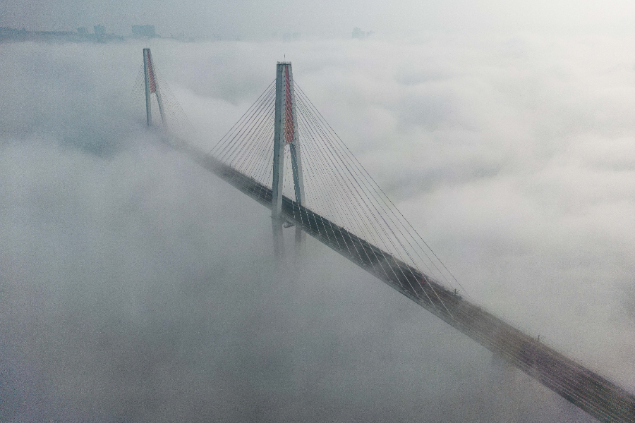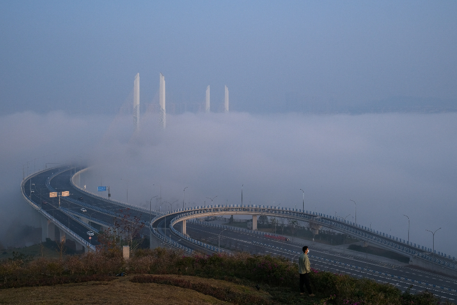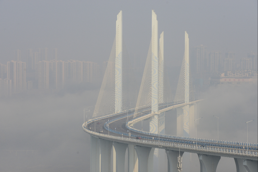 重庆主城区的蔡家嘉陵江大桥被大雾环绕。(图片来源:中新社)