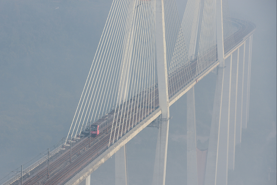 重庆轨道交通6号线行驶在被大雾笼罩的蔡家轨道大桥上。(图片来源:中新社)