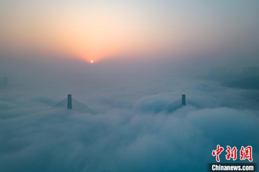 日出时分,蔡家轨道大桥在雾中若隐若现。(图片来源:中新网)