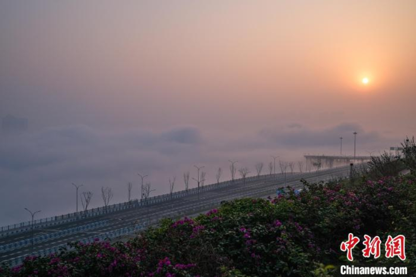 【欧洲时报网】12月21日,重庆多地现浓雾天气。在重庆主城区的蔡家嘉陵江大桥和蔡家轨道大桥附近,随着第一抹晨光升起,江面雾气飘渺,轨道列车与跨江大桥在云雾中若隐若现,如履仙境。