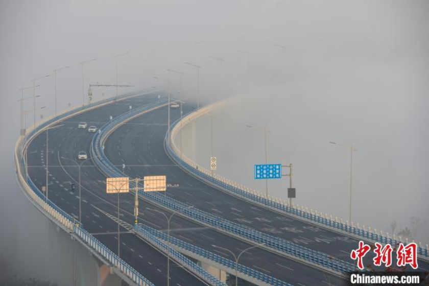 大雾环绕的重庆蔡家嘉陵江大桥。(图片来源:中新社)