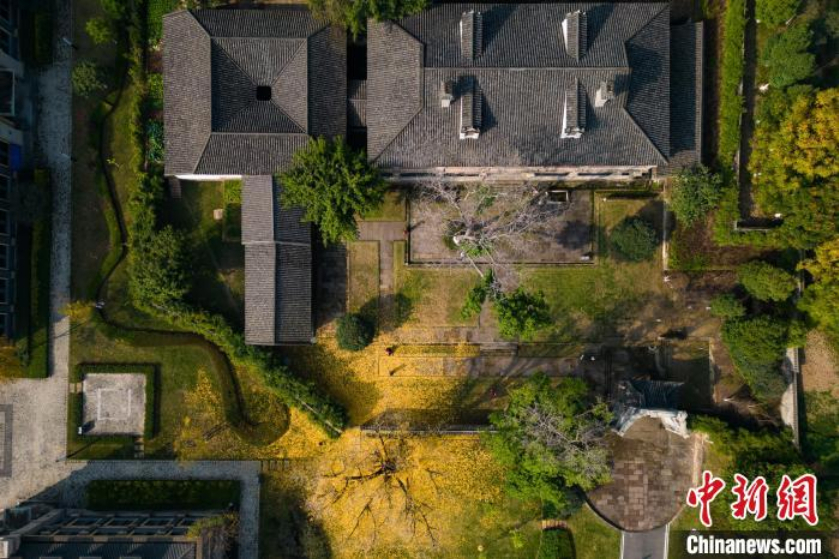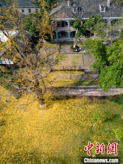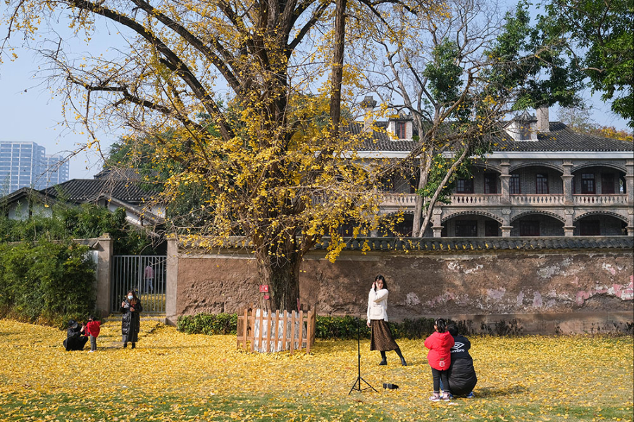 【欧洲时报网】12月21日,在重庆北碚区蔡家街道陈家大院(又名:举人楼)外,一株300多岁的古银杏树满目金黄,落叶缤纷。古树周围,大片金黄的银杏叶随风撒落,形成柔软的“黄金”地毯,吸引不少市民前来观赏拍照。