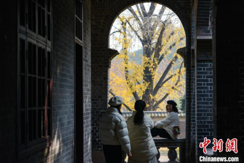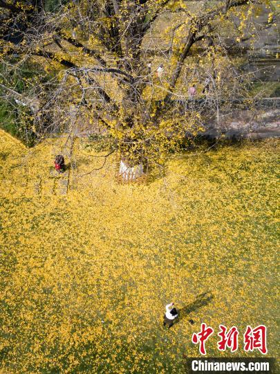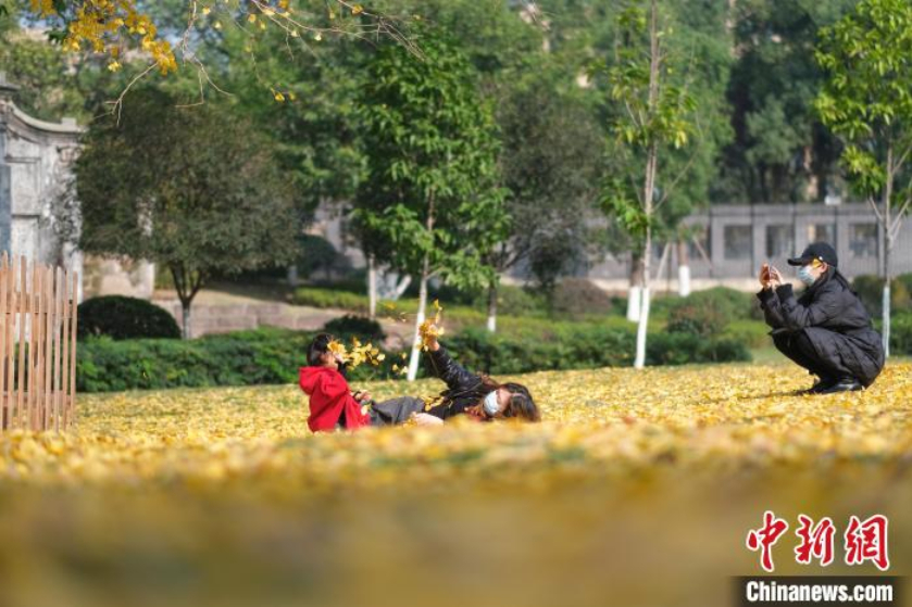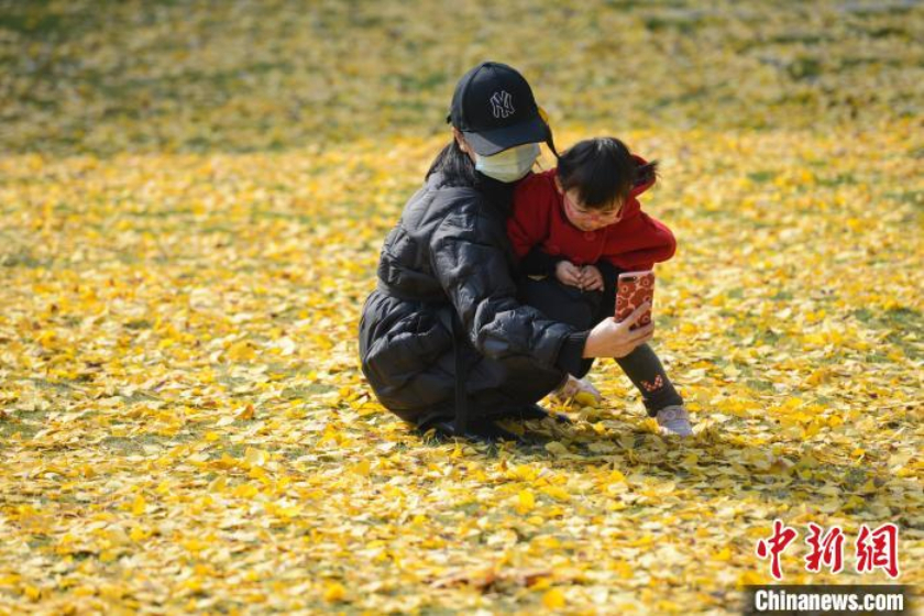 市民在银杏树下拍照游玩。(图片来源:中新网)