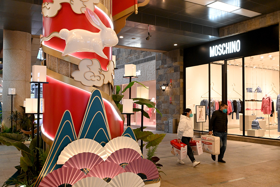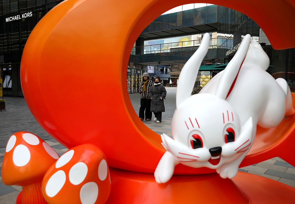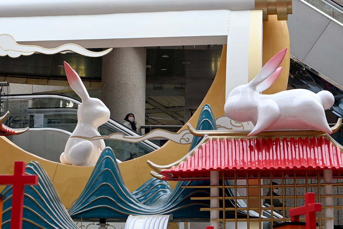 12月21日,北京三里屯太古里的白兔造型装饰亮相街头,迎接癸卯兔年的到来。