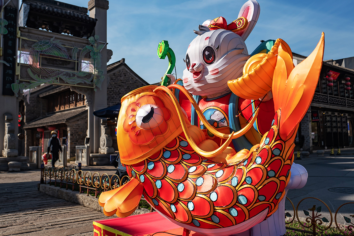12月20日,江苏南京,街头布置的兔年彩灯增添喜庆气氛。