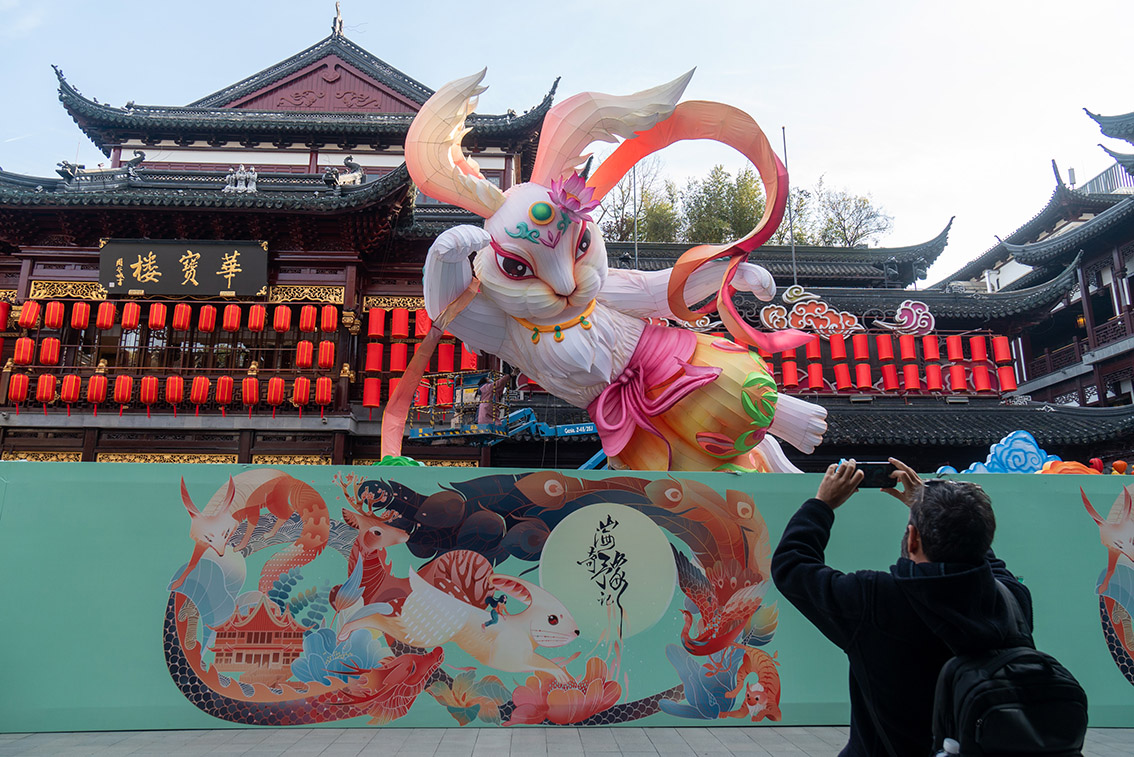 2022年12月20日,上海,“2023豫园迎新年”主题灯组“飞天玉兔”吸引游客驻足拍照。