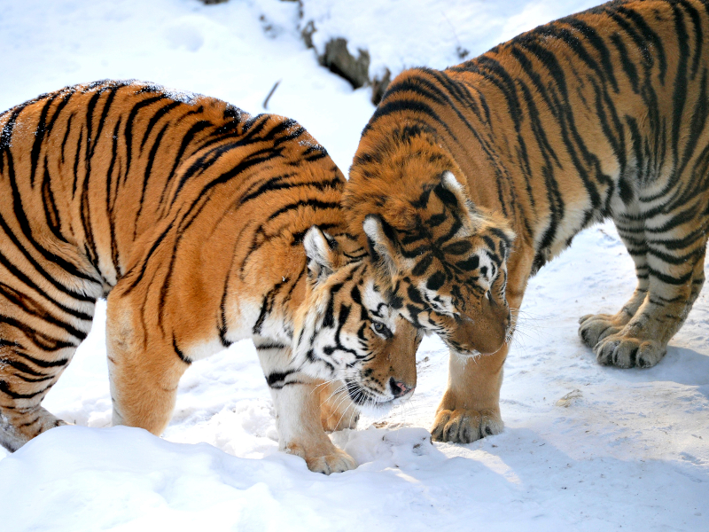 两只东北虎在雪地亲昵互动。(图片来源:中新社)