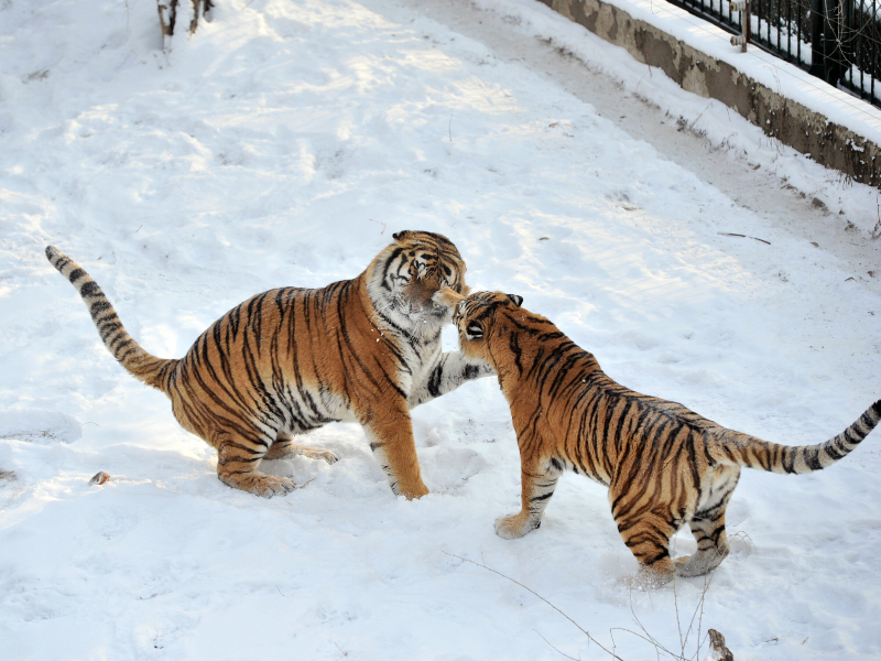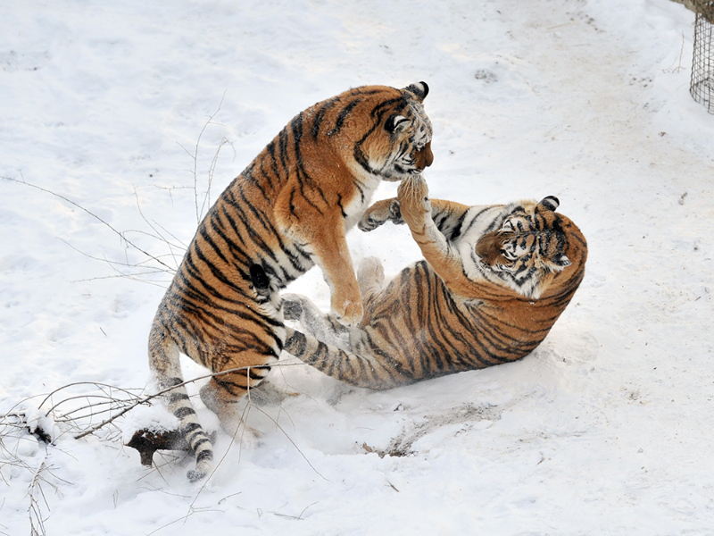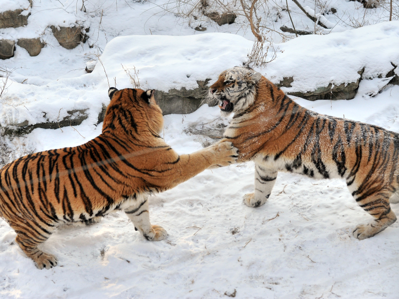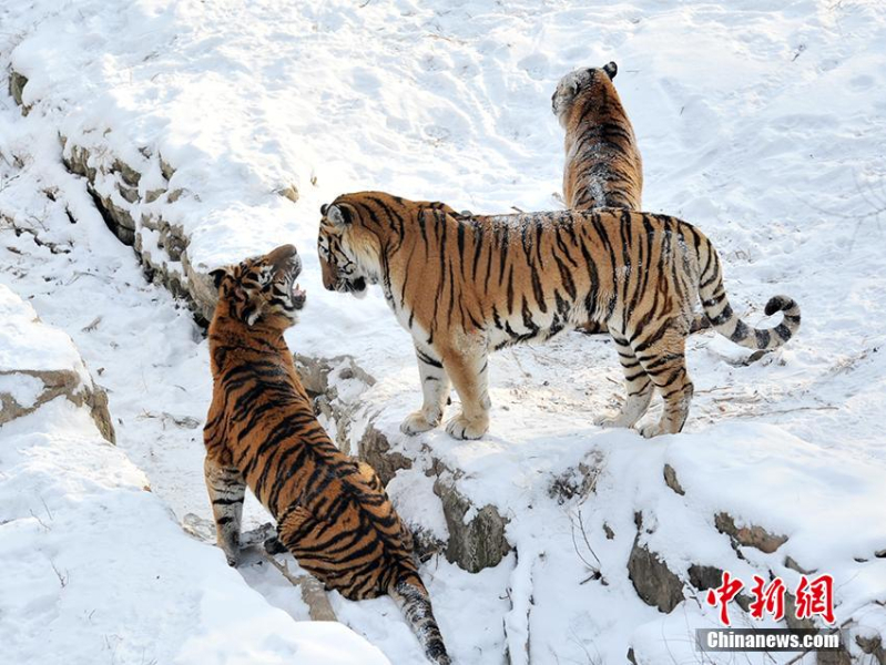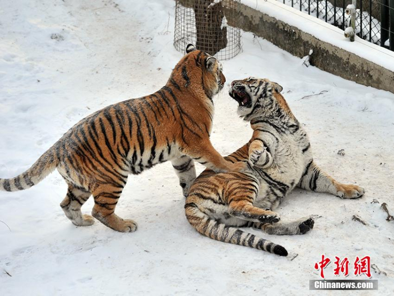 两只东北虎在雪地打闹。(图片来源:中新社)