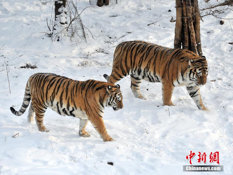 两只东北虎在雪地散步。(图片来源:中新网)