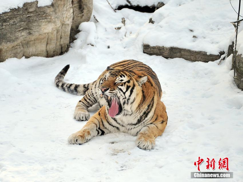 一只东北虎在雪地吼叫。(图片来源:中新网)