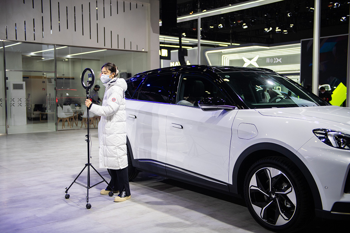 12月24日,在长沙国际会展中心,工作人员直播介绍展车。