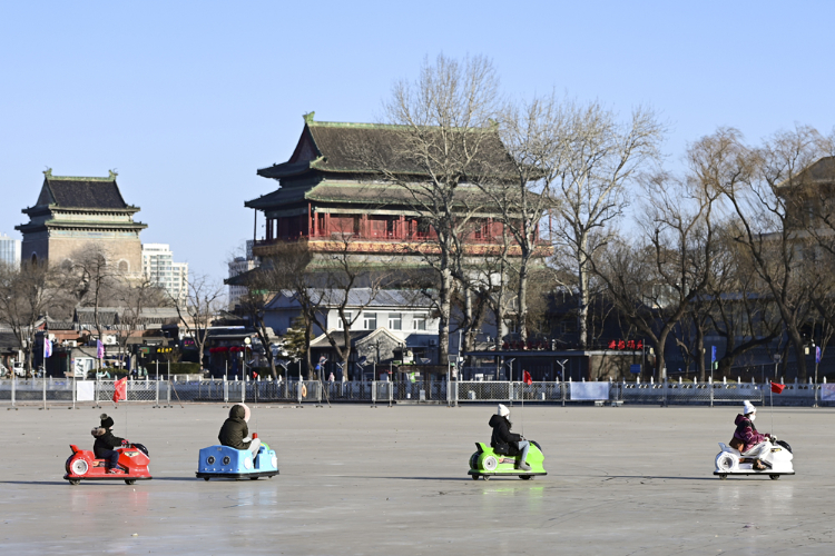 市民在北京什刹海冰场滑冰。(图片来源:中新社)