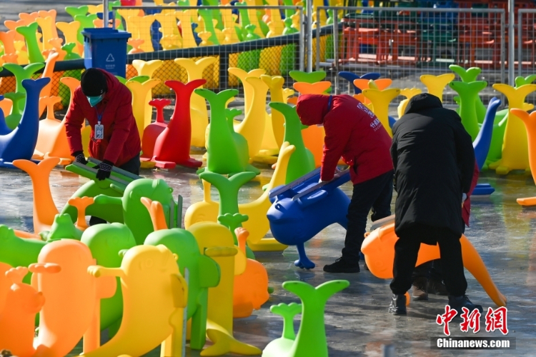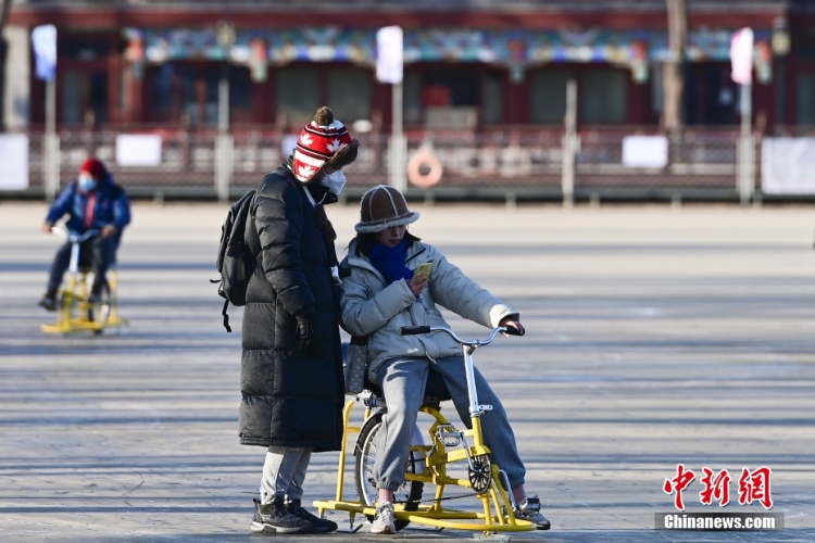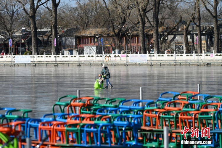 家长带孩童在北京什刹海冰场挑选冰车。(图片来源:中新网)