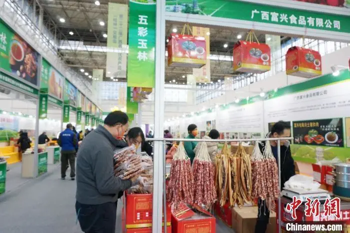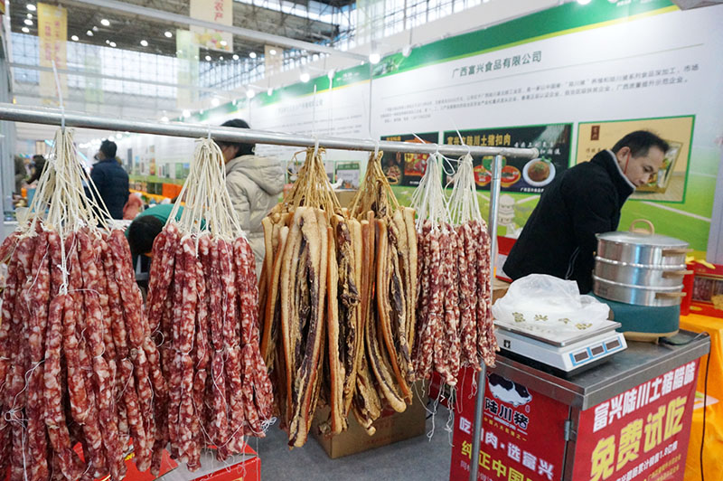 12月29日,参展商带来广西陆川县土猪肉制作的腊肠腊肉。(图片来源:中新网)
