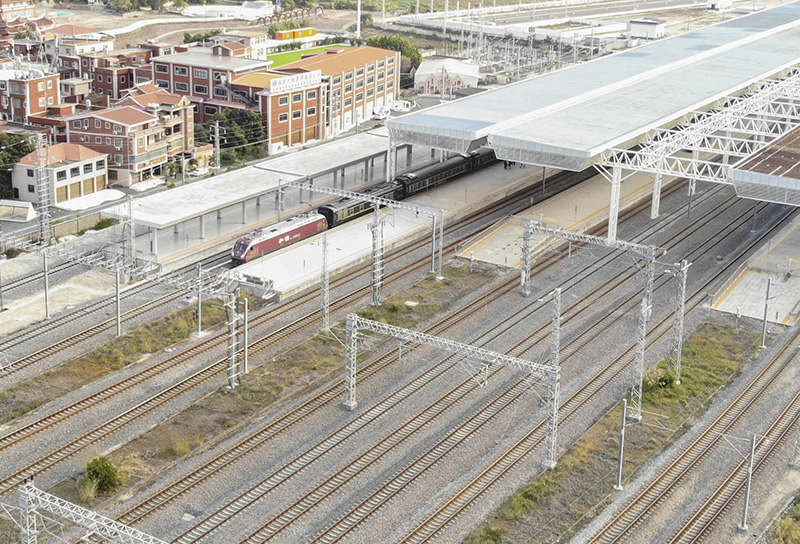 12月30日,在福建泉州站,T8010次列车启程(无人机照片)。(图片来源:新华社)
