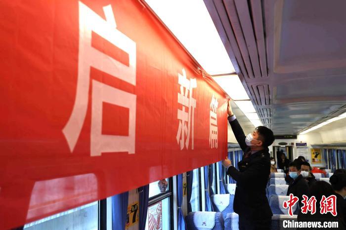 铁路工作人员正在粘贴横幅庆开通。(图片来源:中新网)