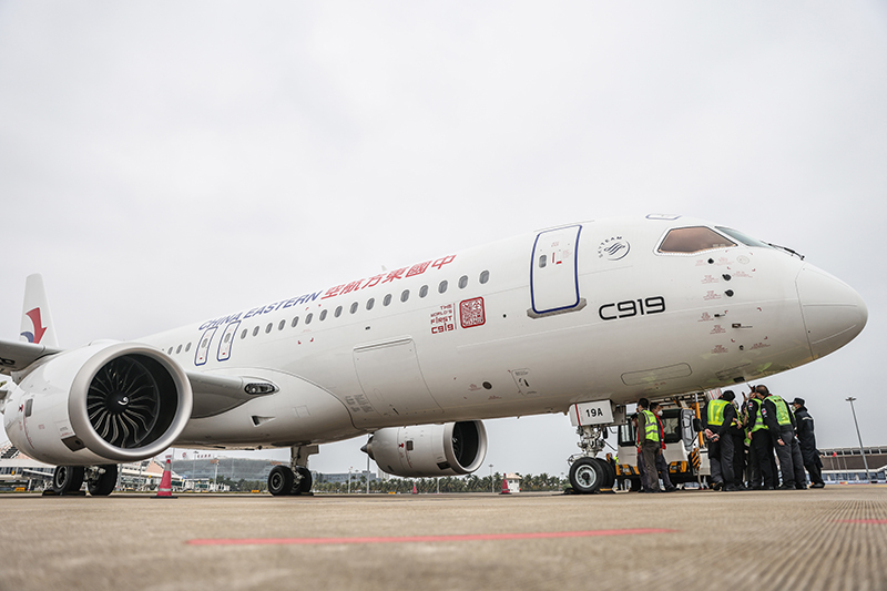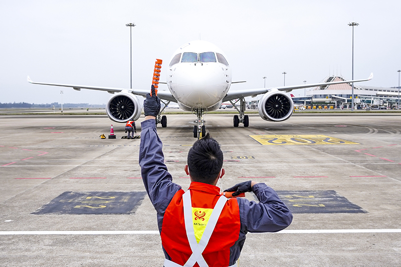 1月2日,国产大飞机C919停在海口美兰国际机场。(图片来源:新华社)