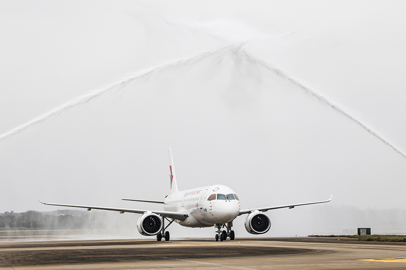 1月2日,海口美兰国际机场为国产大飞机C919举行“过水门”仪式。(图片来源:新华社)