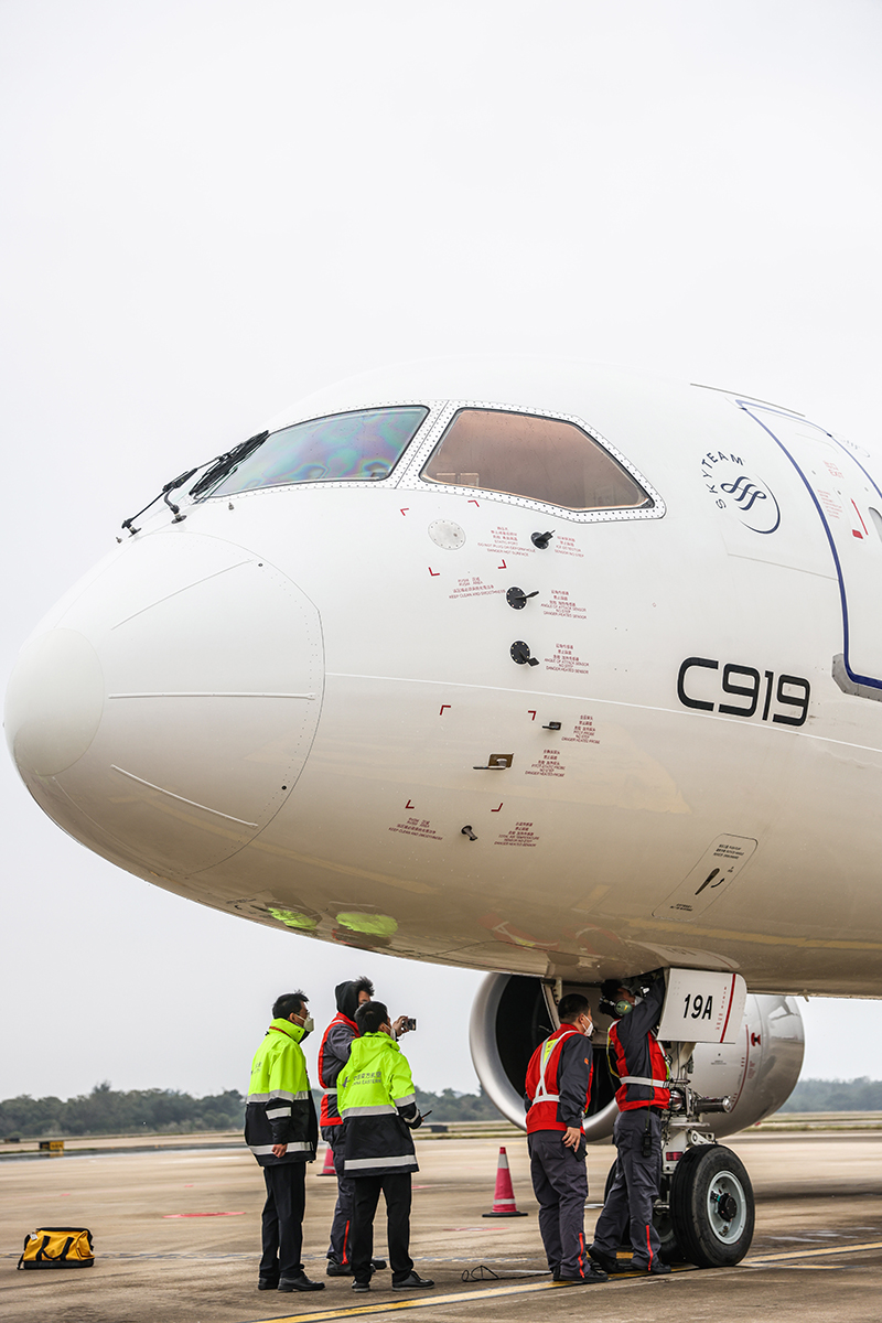 1月2日,海口美兰国际机场的机务人员对国产大飞机C919进行落地检查。(图片来源:新华社)