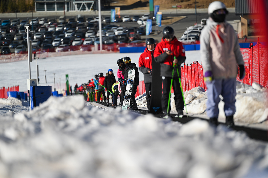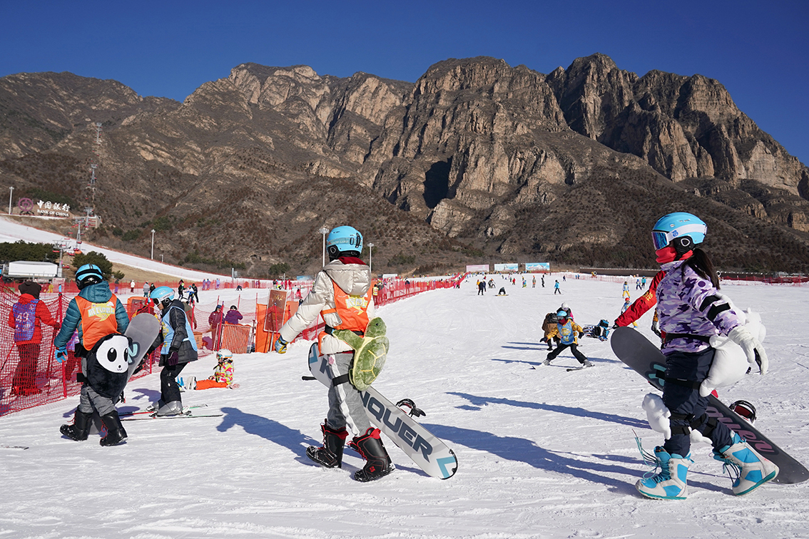 1月2日,在北京市延庆区石京龙滑雪场,几位小朋友拿着雪板准备乘坐魔毯。